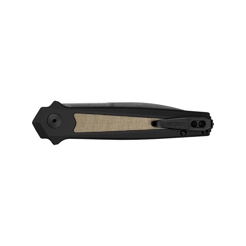 Le manche en aluminium est épuré et dispose d’une incrustation en micarta des deux côtés. Le bouton de déploiement est de faible profil pour minimiser les risques de déploiement accidentel de la lame. Le clip de poche réversible permet un transport facile dans la poche.