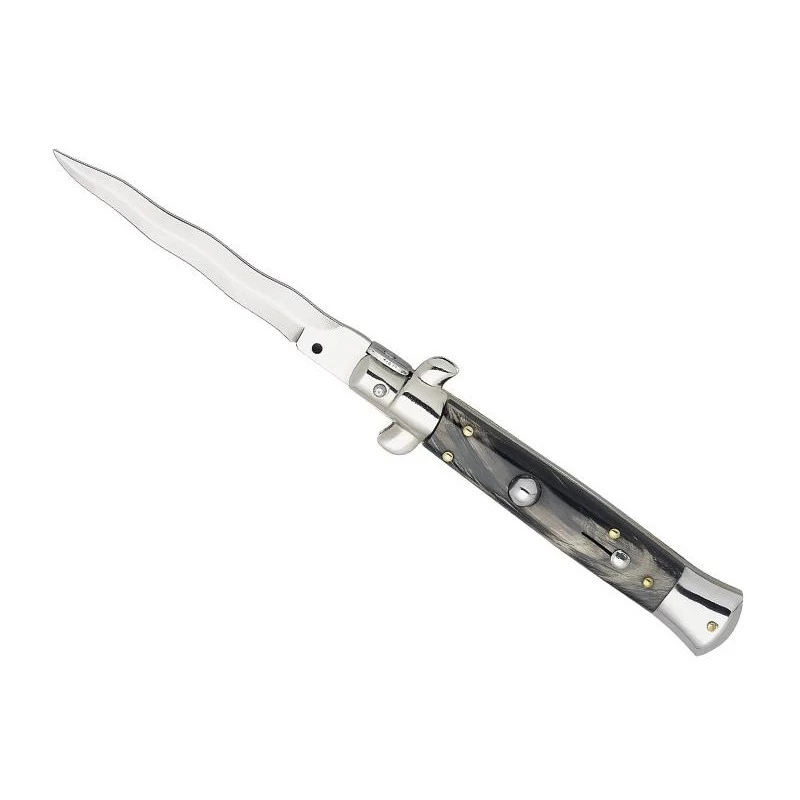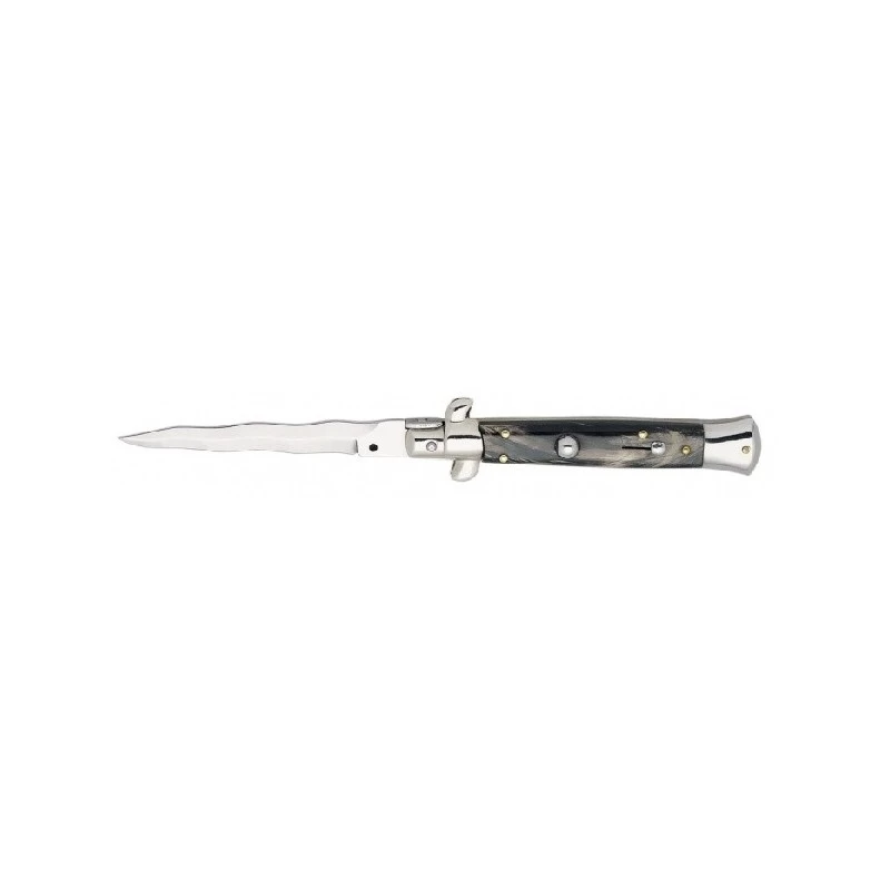 Ce couteau automatique référence 3323 est doté d’une lame kriss en acier inoxydable de longueur 80mm. Résistante à la corrosion, la lame kriss se reconnait facilement en raison de ses multiples “vagues“. Le manche lui est conçu en corne avec mitre basculante et mesure 12cm de longueur, le couteau automatique 3323 est donc relativement facile à transporter en toutes circonstances. L’avoir en permanence sous la main est donc à la portée de tous, il suffit juste de l’introduire dans sa sacoche ou poche de vêtement. Le mécanisme automatique assure une ouverture de lame rapide et sécurisée.