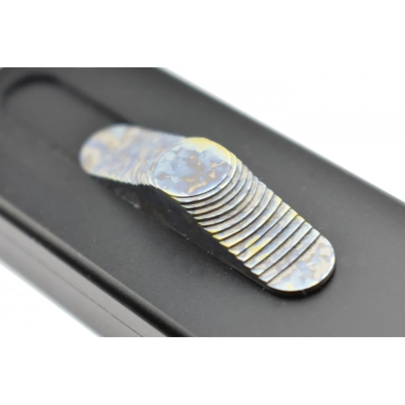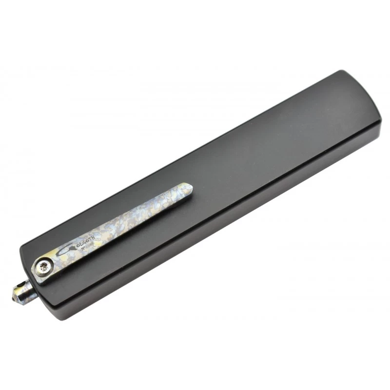 L’ouverture de la lame spear point se fait par l’avant, en utilisant le bouton d’ouverture situé sur le manche en aluminium aéronautique noir. Il bénéficie d’une finition titane anodisation crazy, à savoir des tâches multicolores pour un effet des plus sublimes. D’autres éléments ont cette jolie finition crazy, comme les vis, le clip de ceinture au dos ainsi que le brise-vitre avec extrémité en céramique. Avec une longueur de 121mm, ce couteau automatique OTF tient facilement dans la main ainsi que dans la poche, pour vous prêter main forte en cas de besoin !