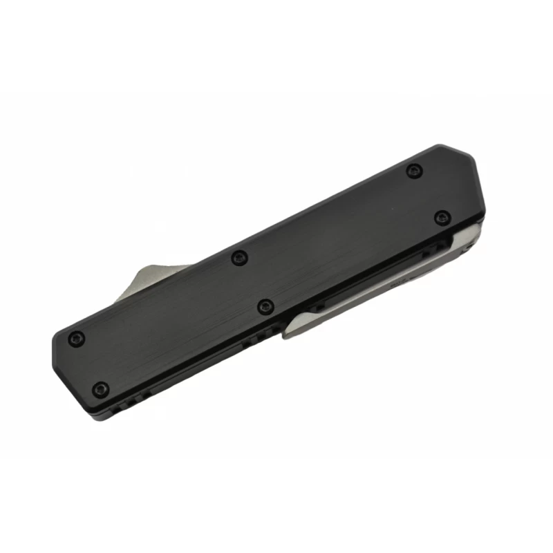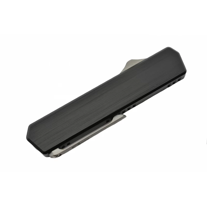 Le manche du Golgoth G13DT est fait d’aluminium anodisé de couleur noire : il mesure 115mm de long afin de pouvoir être aisément transporté d’un point A à un point B. La poignée est bien sûr dotée d’un bouton servant à éjecter rapidement la lame droit devant ainsi qu’un clip latéral : ces deux éléments sont faits de titane robuste.