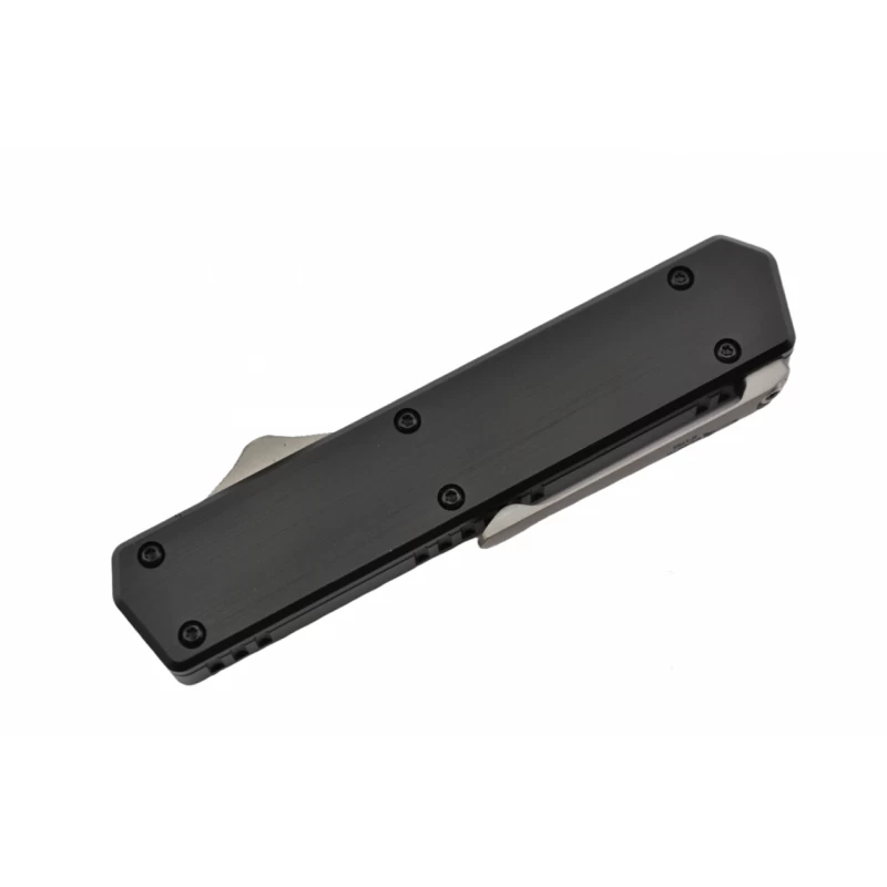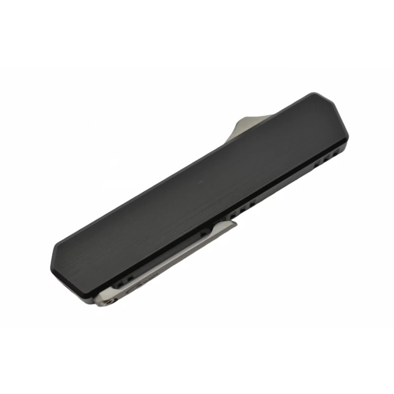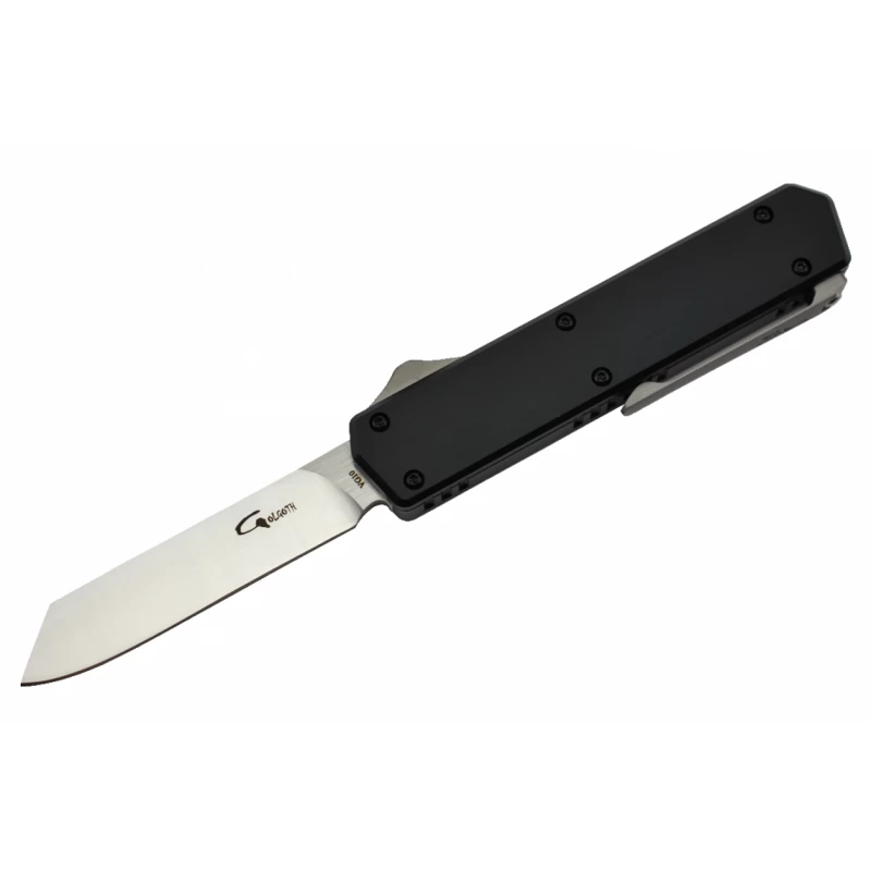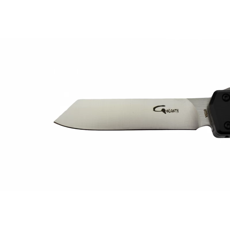 À la fois sobre et performant, le Golgoth G13V coche toutes les cases. C’est un couteau automatique OTF plus que convaincant, doté d’une lame de forme viking ou encore reverse tanto, conçue en VG10, un acier inoxydable d’origine japonaise. D’une longueur de 8cm, elle est marquée par le logo de la marque ainsi que plus discrètement par le type d’acier employé. Elle s’ouvre de façon brusque et soudaine par l’avant lorsque l’utilisateur ou l’utilisatrice fera coulisser le bouton placé sur le côté du manche. Ce dernier est fait de titane, tout comme le clip de poche, un matériau assurant une très bonne robustesse et donc durabilité. D’une longueur de 115mm, le manche est fabriqué en aluminium anodisé de couleur noire : il tient bien dans la main et n’aura aucun mal à être rangé, notamment dans une poche ou dans un sac. L’assurance que votre Golgoth G13V ne soit jamais loin de vous, ou plutôt de votre main !