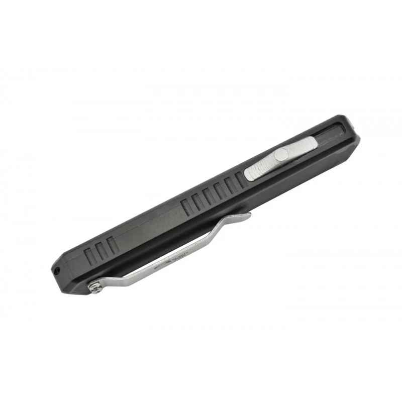 Le Golgoth G6 est un couteau automatique OTF muni d’un manche en aluminium anodisé noir (6061-T6), avec insert en G10 du même coloris. Sur le côté de la poignée, on observe la présence d’un bouton poussoir en alliage d’aluminium, qui est à l’origine du déploiement de la lame vers l’avant, de façon automatique. Le manche noir tient parfaitement bien en main, et se transporte aisément grâce à sa longueur de 112mm ainsi que son clip ceinture gris au dos, lui aussi embelli par l’inscription Golgoth. Le G6, un couteau automatique OTF de qualité qui va beaucoup plaire !