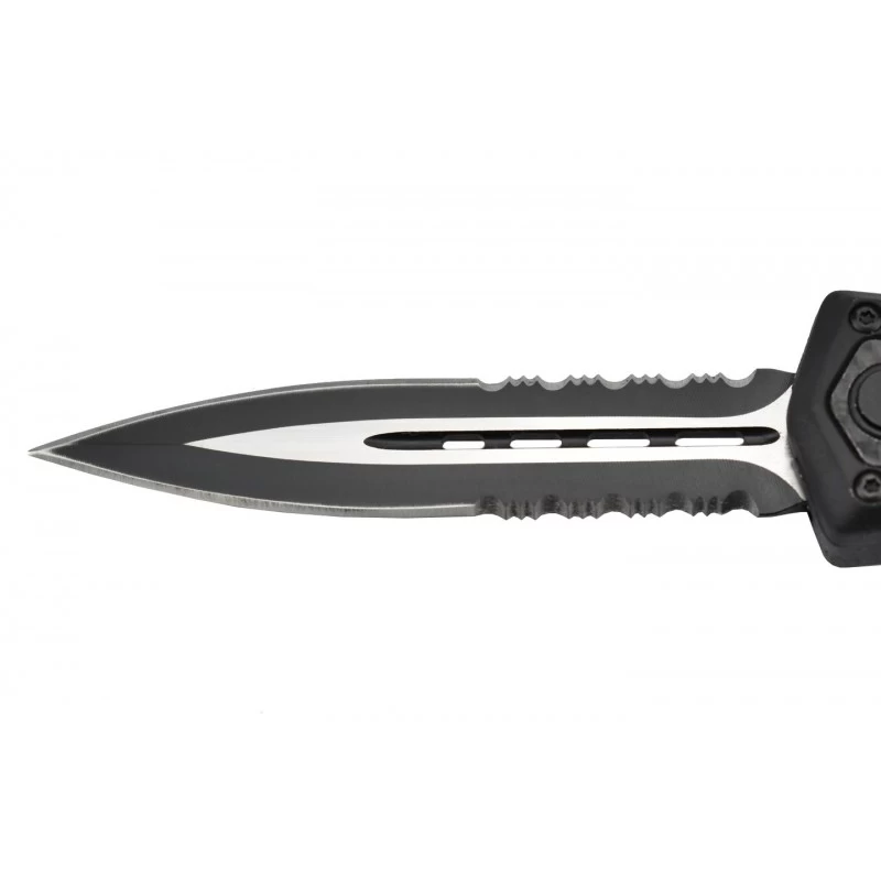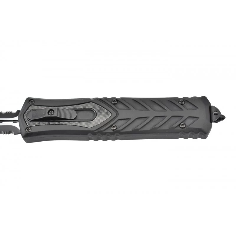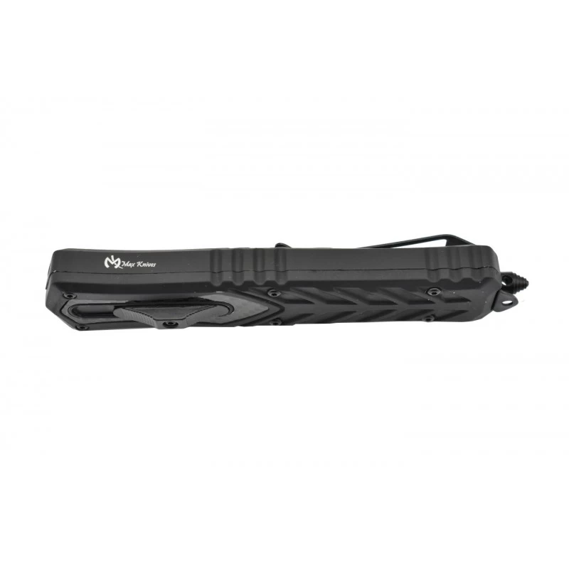 Le Max Knives MKO19 est un couteau automatique OTF, à double tranchant, possédant une lame mixte (lisse/dentée) de 88mm de longueur, en acier inoxydable 3Cr13. Une lame bicolore noire/grise qui est ajourée au niveau du centre pour un aspect des plus stylés, élégants. La lame semi-dentelée offre une plus grande polyvalence au quotidien, elle peut être déployée rapidement via le bouton poussoir situé sur le manche de couleur noire, fabriqué en aluminium ainsi que fibre de carbone. Les textures de la poignée apportent certes du style, mais aussi énormément de confort lors de la prise en main. Même si sa taille est assez grande (137mm en position fermée), le couteau automatique OTF Max Knives MKO19 se transporte bien, grâce à son clip ceinture au dos, ou sur l’autre face si vous préférez. Le brise-vitre noir en bout de manche permet d’intervenir efficacement lors des situations urgentes.
