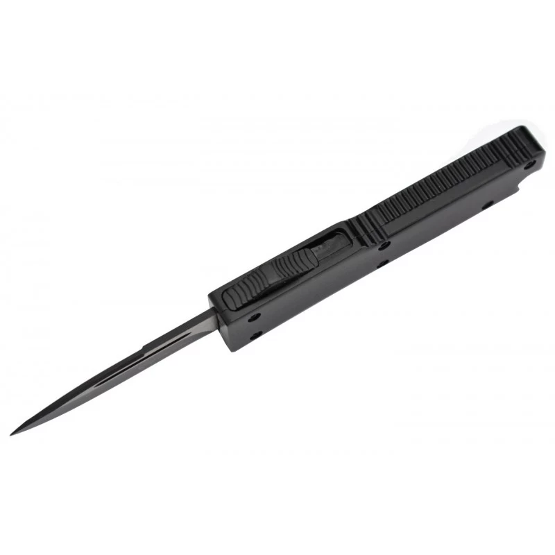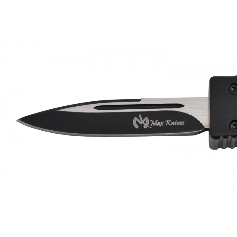 Le Max Knives MKO30 est un couteau qui a tout pour plaire, sans exception. C’est un couteau automatique OTF, à ouverture frontale, et donc par définition très simple d’utilisation, il n’y a qu’à utiliser le bouton ergonomique du manche noir pour actionner la lame. Cette dernière mesure 5cm de long, elle est bicolore ce qui apporte une touche de style, d’élégance, elle est de ce fait en parfaite harmonie avec la poignée noire en aluminium anodisé, gage d’ergonomie et de robustesse. Tranchante, la lame est marquée par le logo Max Knives, et peut être gravée par un texte, une inscription au choix, sur les deux faces. Le manche noir mesure précisément 82mm de long ce qui assure un transport simple et sans encombre quotidiennement, c’est d’autant plus vrai par la présence d’un passe-lacet en bout. Le couteau automatique OTF Max Knives MK030 est ici noir, mais il existe aussi en rouge afin d’apporter une note colorée à vos aventures.
