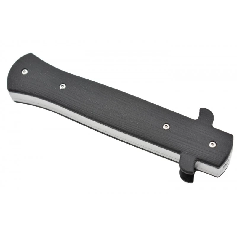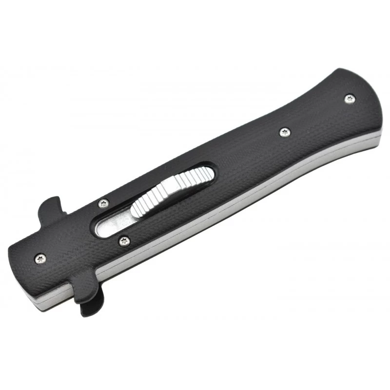 Le modèle Italian Style Max Knives MKO41 est un couteau automatique à ouverture frontale (OTF), qui vous l’aurez compris, arbore un look Italien. Comprenez que sa lame est fine et allongée, elle mesure ici 95mm de longueur et s’avère être conçue en acier inoxydable, un acier dont les propriétés lui permettent de bien résister à la corrosion ou encore rouille. On remarque également que la lame est décorée par le logo Max Knives : elle est aussi personnalisable par gravure. Le couteau automatique OTF double action MKO41 Italian Style, signé Max Knives, possède un manche en métal avec plaquettes de G10 coloris noir. Le bouton poussoir gris clair est facilement visible, ergonomique, il permet de déployer/rentrer la lame en toute simplicité. Les ailerons du manche apportent une petite touche design qui ne manquera pas de faire la différence.