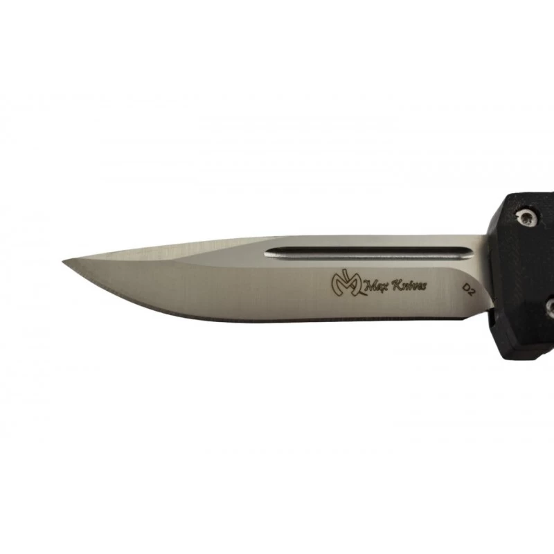 Le manche du couteau automatique OTF MKO4G10NDP Max Knives est conçu en G10 noir, matĂ©riau moderne convaincant aussi bien sur le plan esthĂ©tique que technique. Il loge un bouton poussoir Ă l’origine d’une ouverture de lame par l’avant, de façon extrĂŞmement rapide. Avec clip-ceinture et orifice pour lanière amĂ©liorant encore un peu plus la transportabilitĂ©. Brise-vitre de 10mm en bout pour les situations d’urgence.