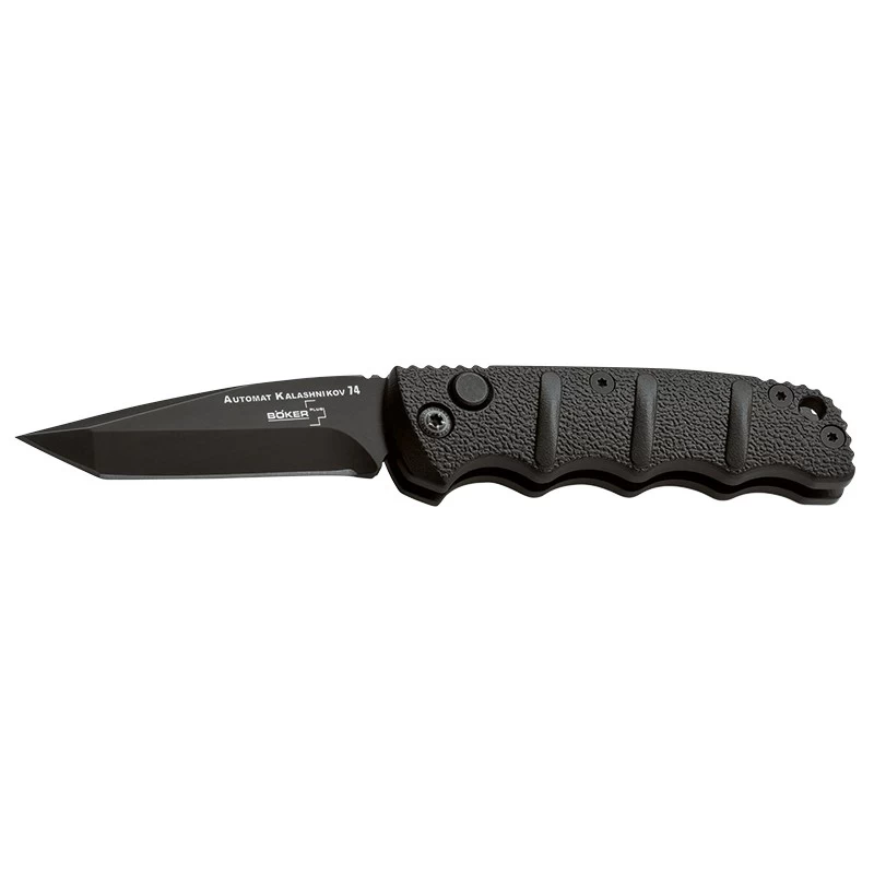 Ce modèle 01KALS73BT est une version réduite ou encore miniature du célèbre couteau automatique Böker Plus, série Kalashnikov. Toujours fait d’aluminium noir, son manche ne mesure ici que 83mm de longueur, une taille permettant de toute évidence de le ranger dans une poche sans rencontrer la moindre difficulté. La poignée est texturée pour un look plus accrocheur mais aussi une meilleure prise en main. Même si l’encombrement du mini couteau automatique est minime, ce dernier intègre également un clip noir au dos pour pouvoir le transporter à la poche ou à la ceinture. D’une longueur de 64mm, la lame est de forme tanto, et fabriquée en acier inoxydable AUS-8 avec revêtement noir. Pour la déployer, rien de plus simple, il suffira d’appuyer sur le bouton du manche. Un gabarit plus compact mais des performances qui restent intactes !