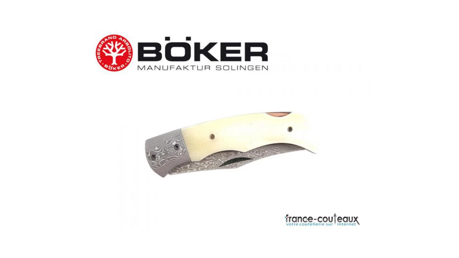 Boker propose le couteau Damascus Bone damassé de ses 49 couches associé a un manche genre ivoire ou os crème.