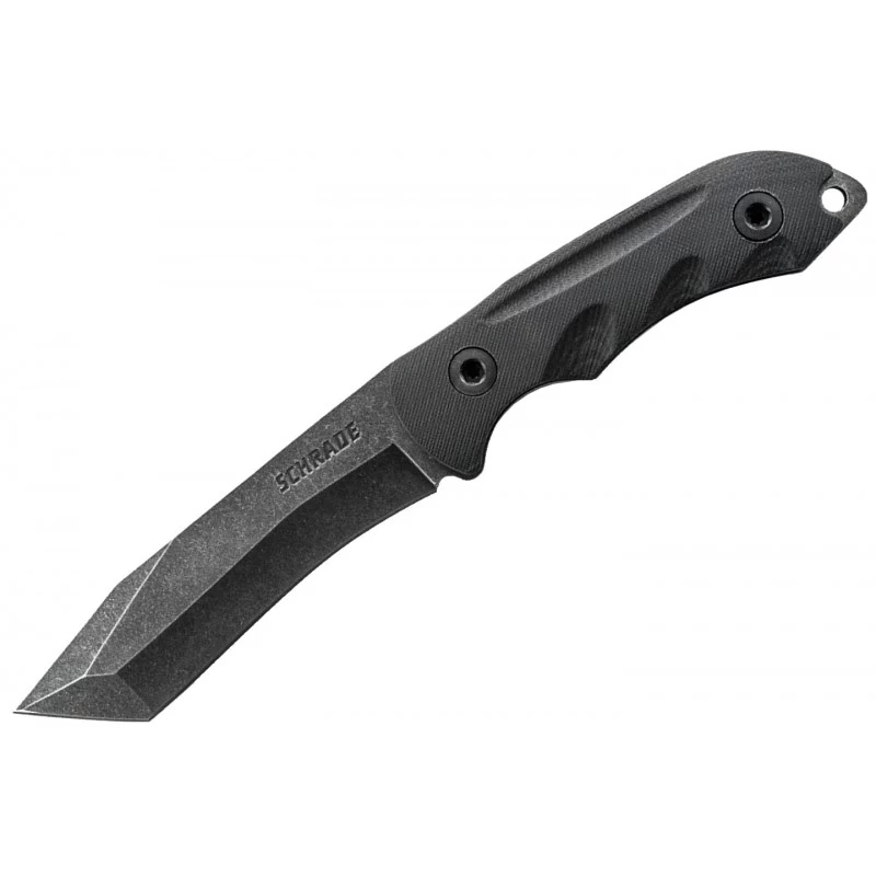 Le Schrade SCHF12 est un couteau fixe, type poignard, convenant pour les applications tactiques ou encore la survie, le bushcraft. Sa lame fixe de construction pleine soie mesure 124mm de longueur, elle est de forme tanto et fabriquée en acier inoxydable 8Cr13MoV, avec une belle finition black stonewashed. Idéale pour perforer ou encore couper, elle est également marquée par l’inscription SCHRADE. La poignée est conçue en G10 noir, matériau léger et très résistant, pour une excellente durabilité. Un trou dans le manche en bout permet de transporter le couteau plus facilement à l’aide d’un cordon par exemple.