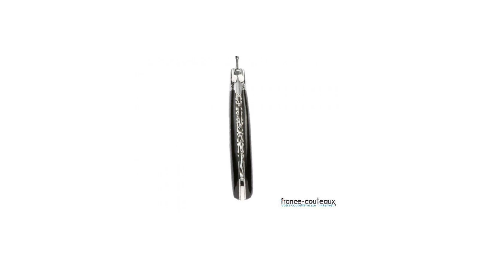Le couteau Laguiole possède un manche en pointe de corne noire fixé soigneusement à la main par 3 rivets, lui procurant un côté esthétique, joli et finement fini. Le guillochage est une opération de gravure produite également à la main sur la tranche de la lame.