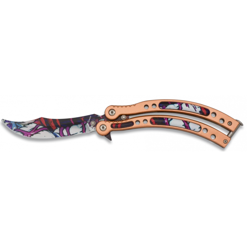 Un magnifique couteau papillon que signe ici Martinez Albainox, fabricant Espagnol à succès. Un balisong que l’on apprécie pour son manche courbé orange fabriqué en ABS/aluminium, avec décor impression photographique 3D. En plus d’être très esthétique, le manche se montre également très maniable (excellente prise en main) ainsi que très transportable en toutes circonstances (longueur d’un peu plus de 140mm). Avec le couteau papillon d’entraînement Albainox Colorful Oranger 02171, l’utilisateur pourra se perfectionner au maniement du balisong n’importe où et n’importe quand car le couteau peut se glisser facilement dans une poche ou une sacoche. Relativement léger, ce modèle dispose aussi d’une lame de longueur 9cm fabriquée en acier inoxydable (résistance à la rouille/corrosion), elle est sublimée par un magnifique décor en parfaite adéquation avec celui du manche. Un balisong Albainox qui ne laissera personne indifférent !
