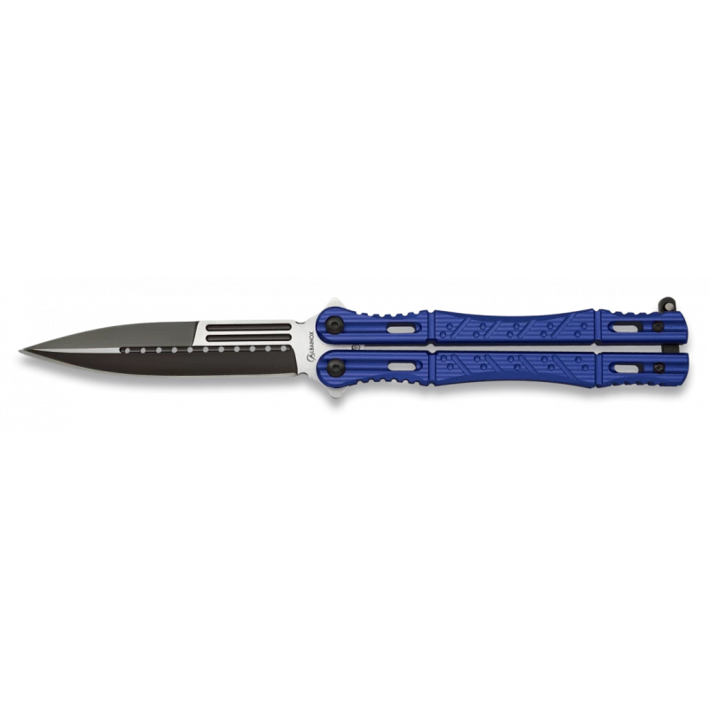 Avec le couteau papillon Albainox Night Fighter référence 02101, vous allez devenir le meilleur combattant de la nuit ! Et autant vous dire tout de suite que ce couteau balisong ne passera pas inaperçu en raison de son manche bleu électrique en aluminium : un manche autant résistant qu’élégant. Pari réussi pour le fabricant Espagnol Albainox qui a conçu un couteau papillon ergonomique doté d’une bonne tenue de main même en cas d’utilisation prolongée. La lame aussi est très originale : de longueur 10,4cm, elle est fabriquée en acier inoxydable blanc mais noir sur certaines parties. On peut également apercevoir sur la lame différents motifs : deux rectangles légèrement arrondis ainsi que de nombreux cercles : 11 pour être très précis. C’est certain, la lame ne ressemble à aucune autre et c’est là toute la force de ce couteau papillon Albainox Night Fighter 02101 ! Bien présenté, le balisong est livré dans une jolie boîte colorée : parfait si vous comptez l’offrir en cadeau à un ami.