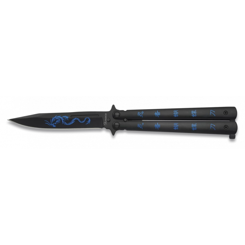 De part sa finition noire intégrale, ce couteau papillon Albainox Night Fighter II référence 02104 a un style très affirmé. Il est vrai qu’il ne passera pas inaperçu au quotidien notamment grâce à sa lame noire de 105mm décorée par un très beau motif dragon bleu. La couleur bleue ressort parfaitement par-dessus le noir et ça tombe très bien, car le manche est lui aussi marqué par de nombreux motifs asiatiques bleus. Agréable à manipuler, le manche est lui fabriqué en aluminium et mesure 118mm de long. Grâce à cela, le balisong Albainox Night Fighter II est relativement facile à transporter au quotidien. Couteau papillon fabriqué en Espagne et vendu avec sa boîte de couleur.