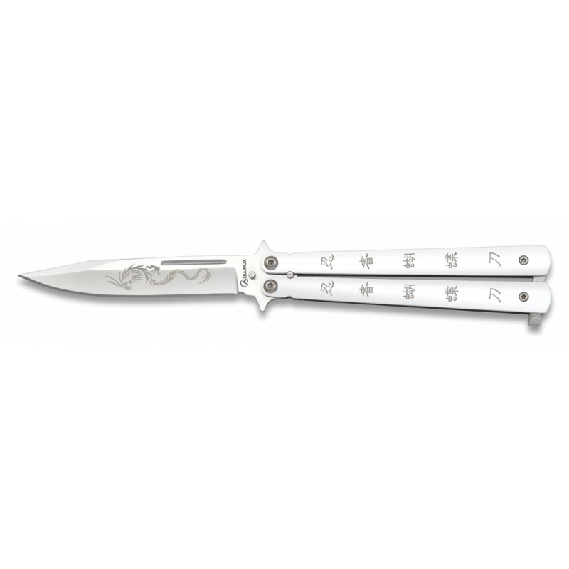 Ce couteau papillon Albainox Ninja Dragon référence 02096 est muni d’une lame de 104mm en acier inoxydable à bout pointu, elle est décorée sur la face avant par un dragon façon tribal. Très belle, la lame assure également un tranchant de qualité en toutes circonstances, elle dispose d’une longue durée de vie grâce à sa résistance à la corrosion. Il est possible de graver le verso de la lame par le texte de votre choix contre un supplément de 8,90€, de quoi obtenir un couteau papillon Albainox Ninja Dragon personnalisé selon vos goûts ! Ce modèle dispose aussi d’un manche blanc en aluminium décoré par des symboles chinois espacés, il est à la fois sobre et design et confère une prise en main exceptionnelle. Conçu en Espagne, ce couteau papillon est en plus livré avec une belle boîte colorée : parfait pour se faire plaisir ou pour offrir à quelqu’un aimant les couteaux balisong et les dragons !
