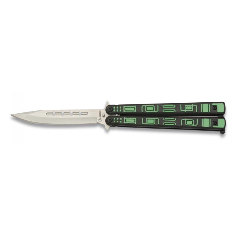 Le couteau papillon Albainox 36244 est un modèle impressionnant avec ses motifs verts éclatants sur un fond noir. Il est conçu pour offrir des effets visuels incroyables lors de l’exécution de tricks.