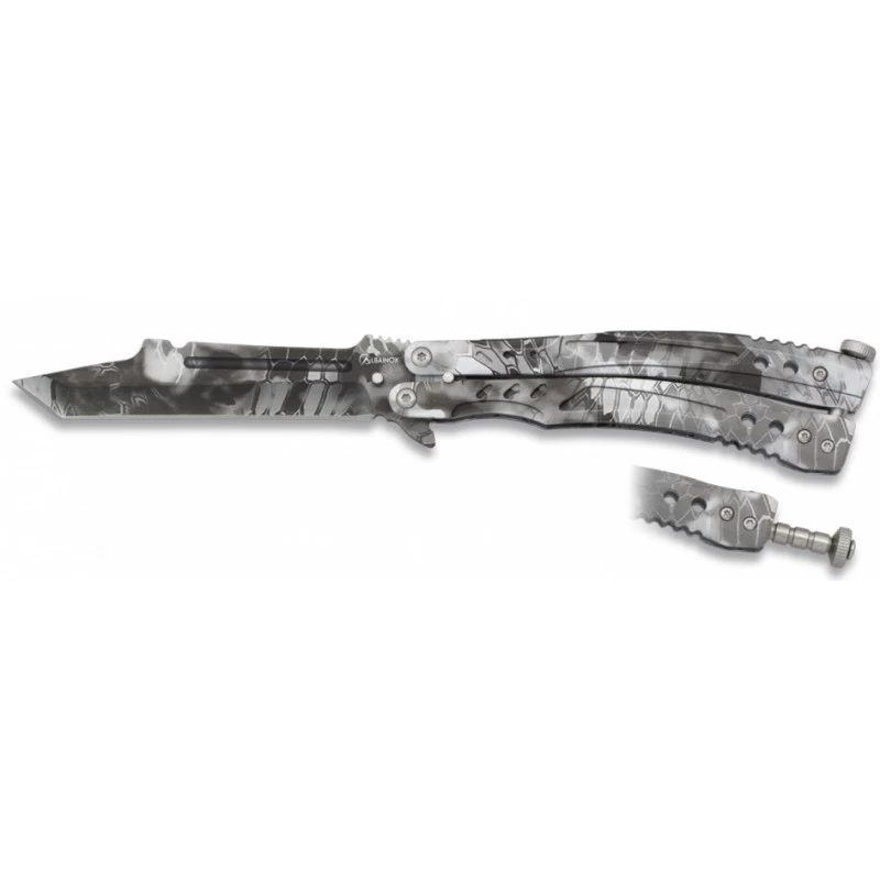 Ce modèle 02176 de chez Martinez Albainox est un couteau papillon à l’apparence à la fois élégante et originale. Il s’agit du balisong Phyton noir, qui est sublimé par un magnifique décor camouflage coloris grisâtre, avec des nuances plus ou moins claires ou sombres selon l’endroit. Cela permet de créer un design très contrasté, et de ce fait très harmonieux, qui ne manquera pas d’attirer le regard.