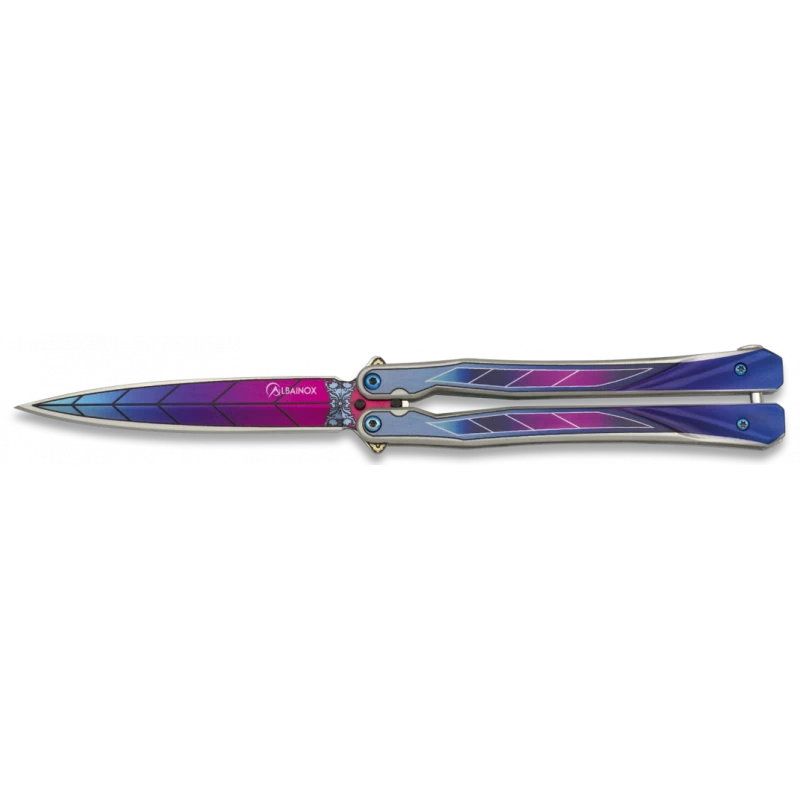 Le couteau papillon Albainox 02148 est décoré par une multitude de couleurs (nuances de violets et bleues), et ça, aussi bien au niveau de la lame que du manche. Le passage d’une couleur à l’autre se fait de façon progressive pour un effet juste très élégant. Fabriqué en Espagne par Martinez Albainox, ce balisong est muni d’une lame de 10cm en acier inoxydable avec bel effet polychrome mauve/bleu et lignes noires. Une lame résistante à la corrosion qui ne manque pas d’allure ! Et en terme de design, le manche en acier n’est pas en reste, bien au contraire. Agréable à prendre en main, il est lui aussi polychrome et se révèle parfait pour la réalisation de tricks. Couteau papillon Albainox 02148 relativement léger avec un poids de 116g, il est de ce fait facile à transporter au quotidien.