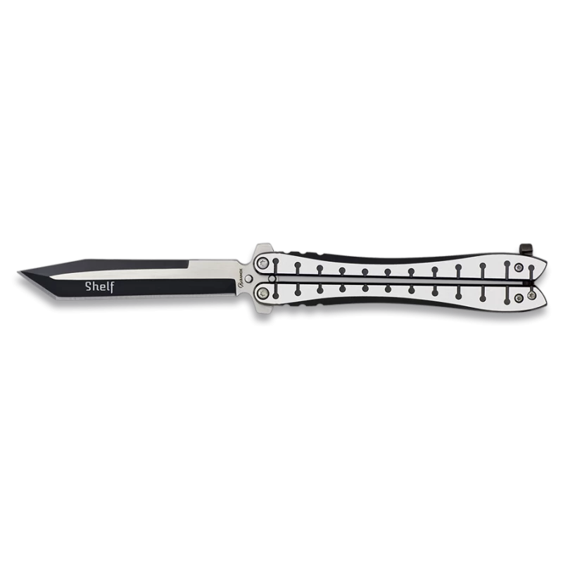 Ce couteau papillon Albainox référence 02112 modèle Shelf est facilement identifiable par sa lame en acier inoxydable à bout pointu comprenant une zone noire marquée par le texte “Shelf“. Mesurant 10cm de longueur, la lame est très tranchante et résiste parfaitement à la corrosion : il est possible de la personnaliser au verso. Le manche est lui aussi fabriqué en acier inox et présente des motifs traits verticaux symétriques : il est vraiment très élégant. Conçu en Espagne, le couteau papillon Albainox Shelf est d’une qualité remarquable pour un prix de vente très attractif : il va plaire au plus grand nombre. Comme pour la grande majorité des couteaux balisong Albainox, le modèle Shelf est vendu dans sa jolie boîte colorée.