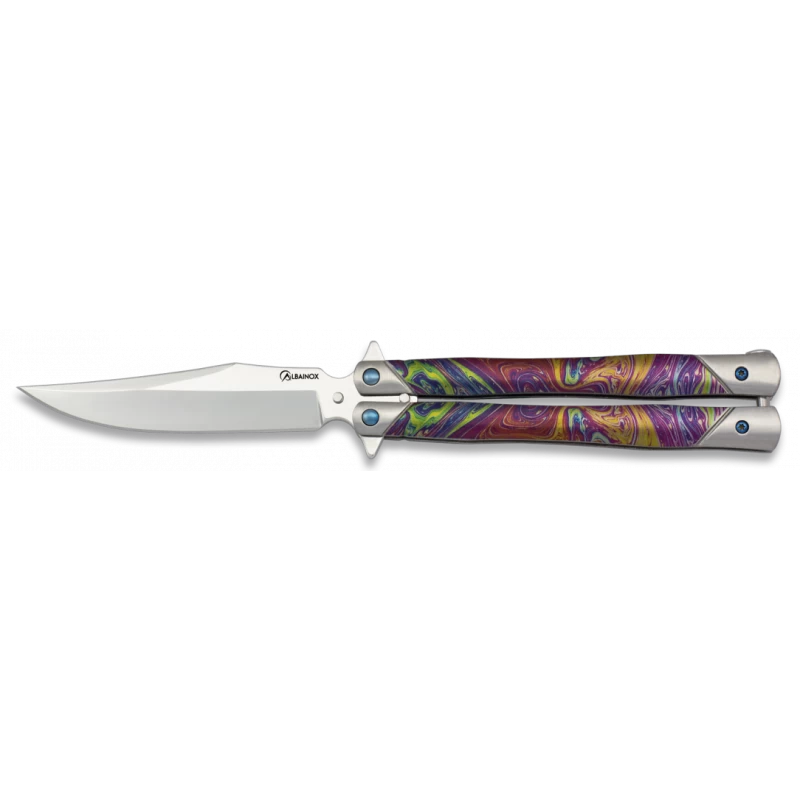 Tout simplement Waoouhhh ! Ce couteau papillon Martinez Albainox (fabricant Espagnol) est juste hyper élégant en raison de son manche en acier sublimé par une impression photographique en 3D. Le décor 3D est fascinant, il est multicolore si bien que l’on distingue plusieurs coloris : du vert, du bleu, du rouge, du orange et bien d’autres. On peut le dire, il s’agit d’un décor abstrait qui plaira sans doute au plus grand nombre : difficile de rester insensible face à tant d’élégance. De longueur 132mm, le manche possède également des extrémités en inox avec boutons bleus afin d’apporter encore plus de style à ce balisong Albainox extraordinaire. Même si le manche est incontestablement la partie que l’on remarque le plus, n’oublions pas la lame de 10cm en acier inoxydable avec logo Albainox. Une lame qu’il est possible de graver sur les deux faces (voir bouton ajouter une gravure ci-dessous pour la personnalisation). Un formidable couteau papillon Albainox 02149 pour des figures (tricks) incroyables !
