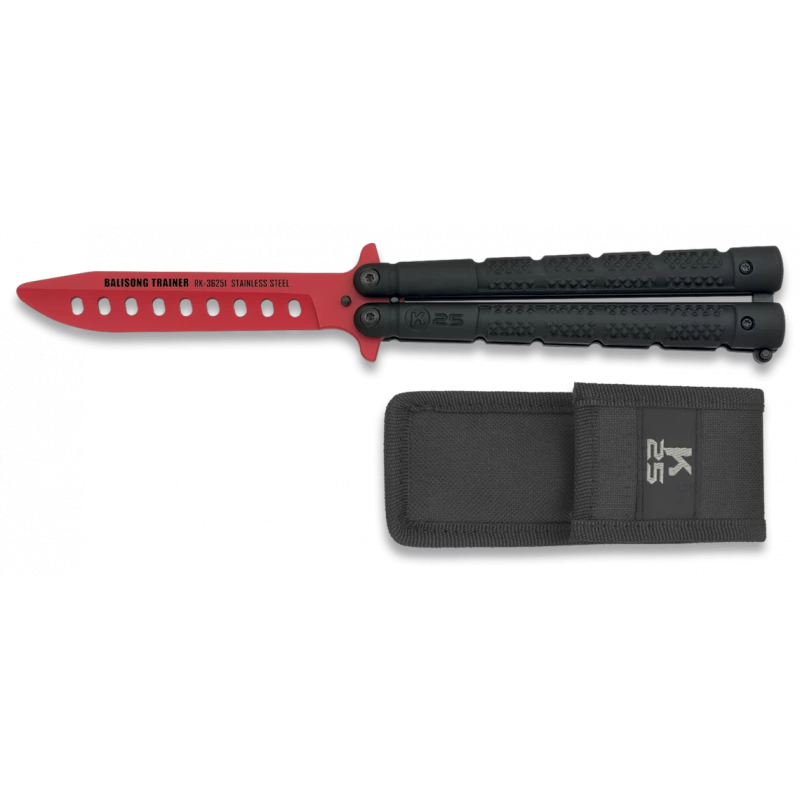 Ce couteau papillon K25 référence 36251 est un modèle d’entraînement également appelé “Balisong Trainer“. Il a pour but de se perfectionner au maniement de ce type de couteau, c’est pour cette raison que la lame en acier inoxydable revêtement rouge dispose d’un bout de forme légèrement arrondie pour éviter les blessures. De longueur 102mm, la lame est ajourée par 9 trous et comporte l’inscription “BALISONG TRAINER RK-36251 STAINLESS STEEL” inscrite en noir.