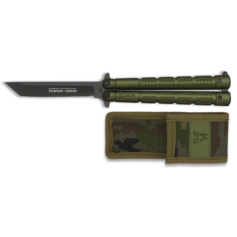 Ce couteau papillon K25 36249 dispose d’un look très militaire. En effet, il possède un très beau manche vert en aluminium de longueur 12,5cm où l’on peut apercevoir le logo de la marque K25 en guise de décoration. Agréable à utiliser, ce balisong dispose aussi d’une lame en acier inoxydable noir revêtement titane marquée du texte “titanium coated” en blanc. À bout pointu, la lame de longueur 10cm est très tranchante et bénéficie d’une excellente robustesse notamment face à la corrosion. Petite précision, l’épaisseur de lame est de 3mm. Pratique, ce couteau papillon K25 est livré avec son étui en nylon camouflage appartenant également à la marque K25. Bien évidemment il est parfaitement adapté au couteau et permettra de le protéger avec élégance lors des interventions et missions ! Ce balisong est parfait pour tous les fans de l’univers militaire.
