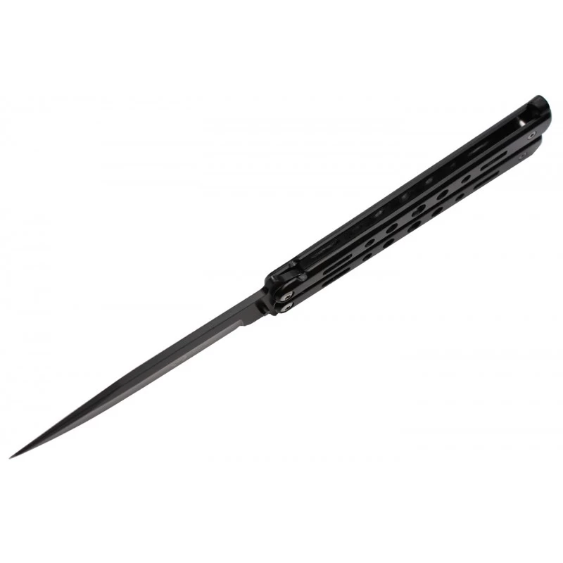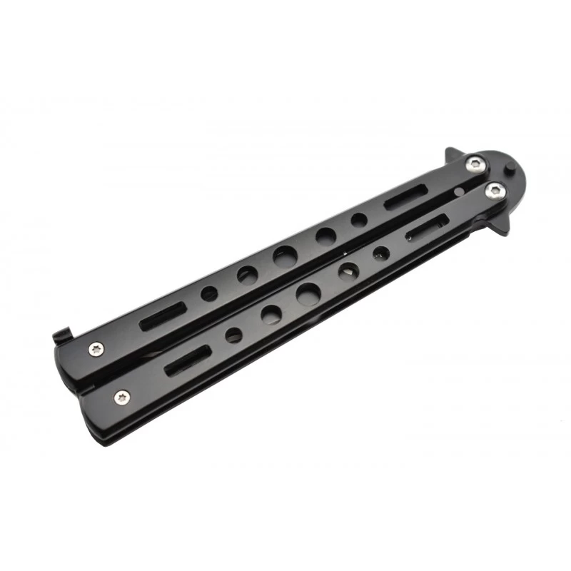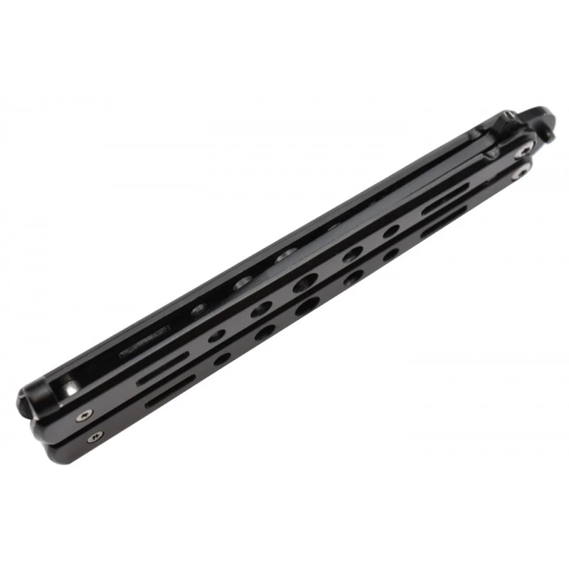 L’originalité de ce balisong repose en grande partie dans son manche ajouré par des formes rondes et rectangulaires. Fabriqué en alliage d’acier noir, la poignée de 12.2cm est composée de 2 bras sur pivot qui s’assemblent grâce à un loquet.