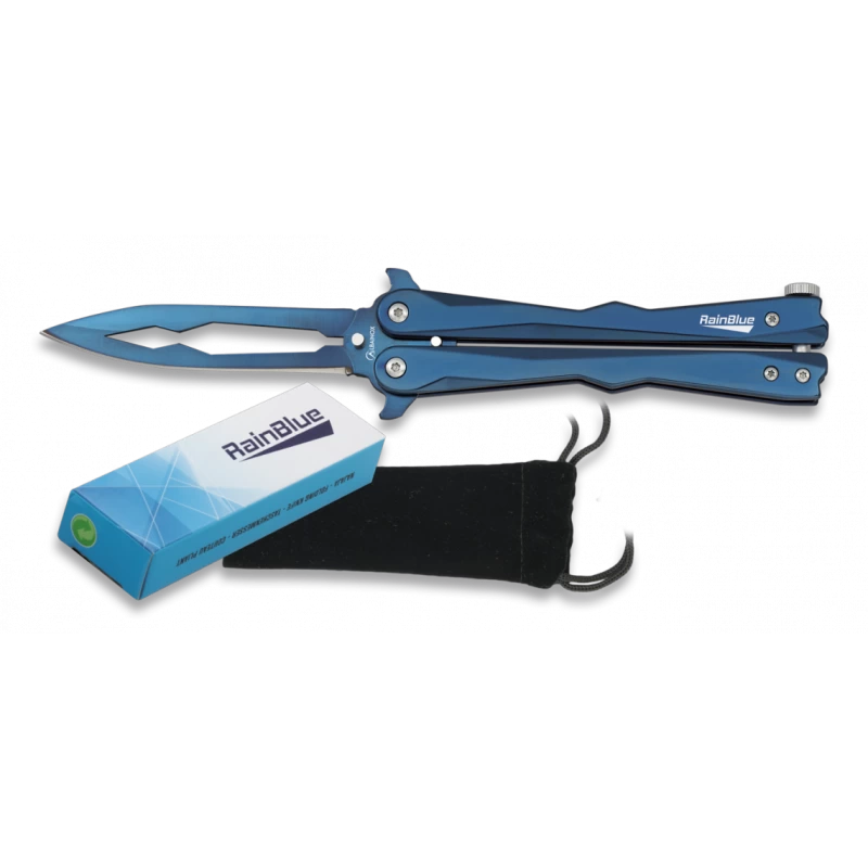 Il est entièrement bleu, c’est le couteau papillon Rainblue muni ici de la référence 02133 ! Ce modèle est caractérisé par un manche en aluminium de forme originale, on peut même apercevoir le logo Rainblue en blanc. Une forme géométrique composée de lignes inclinées pour un effet très déstructuré ! Côté lame, elle est conçue en acier inoxydable et mesure 91mm de longueur. Sa particularité, c’est d’être ajourée par un motif également géométrique pouvant par exemple faire penser à une épée. Fabriqué en Espagne, ce balisong Rainblue 02133 est vendu avec son étui noir en velours (voir photo), parfait pour ne pas abîmer son couteau papillon lors des déplacements et mouvements.