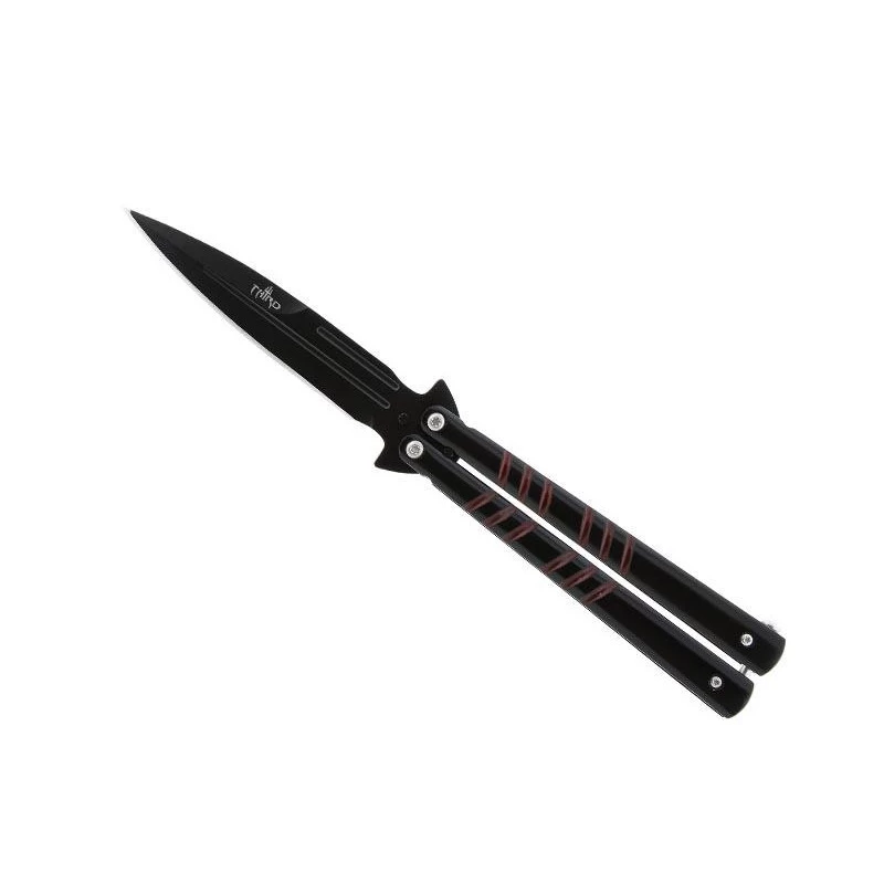 Ce couteau papillon Third référence 911615 est muni d’une apparence très sombre. En effet, il possède une lame noire conçue en acier inoxydable où figure le logo THIRD marqué en blanc afin de parfaitement ressortir. À noter que le manche de longueur 13cm est lui aussi fabriqué en acier et décoré de couleurs sombres : il est noir et violet. Très esthétique, le manche est aussi très maniable et transportable, un couteau balisong signé Third idéal pour apprendre à utiliser un couteau papillon.