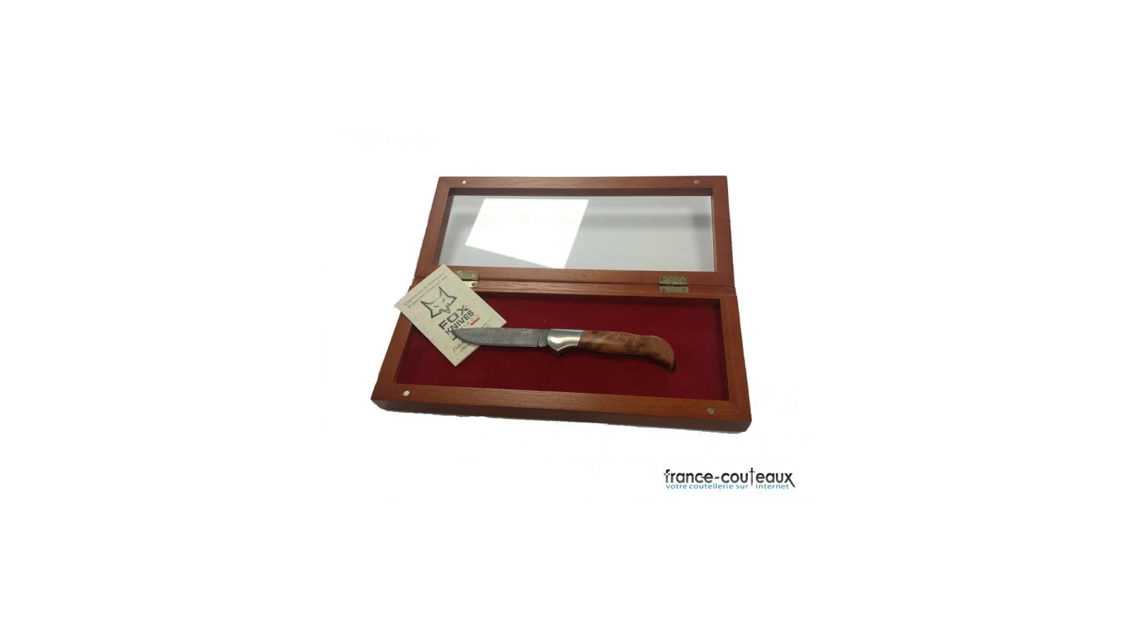 Livré en boite cadeau vitrine en bois et emplacement prédécoupé du couteau sur fond de feutrine.