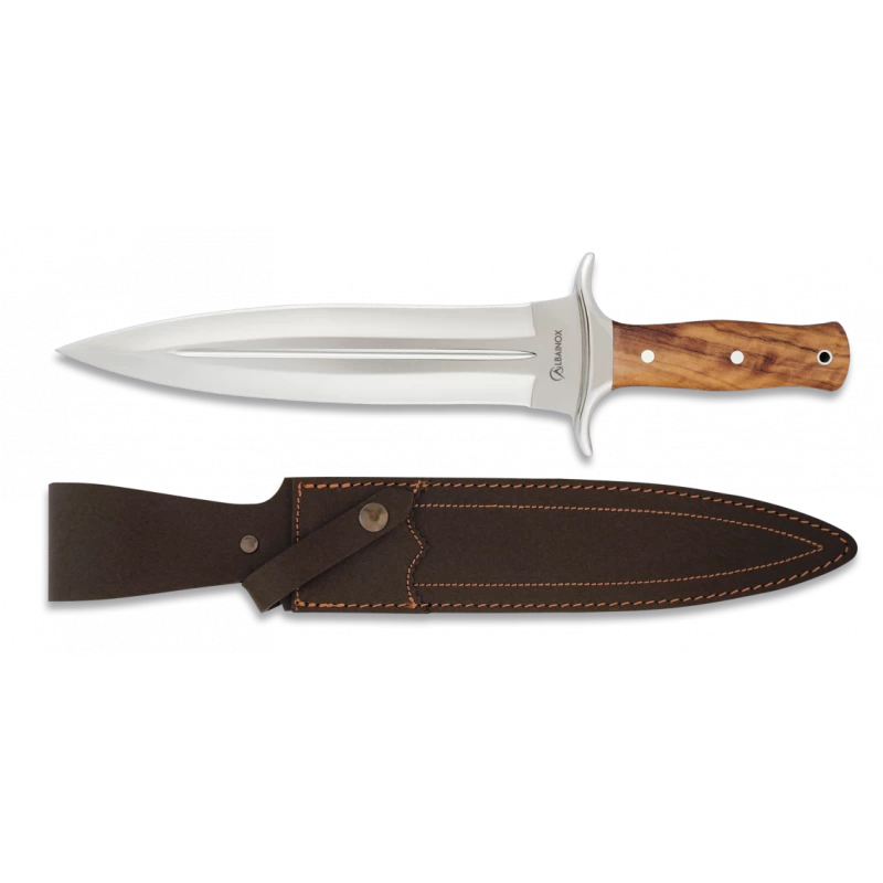 Martinez Albainox est à l’origine de la Rematador, un dague de chasse d’aspect rustique dont les utilisateurs ne cessent de vanter sa fantastique capacité de coupe et sa robustesse. La version 31667 se distingue par sa lame de 23.5 cm de long fabriquée en acier 3CR13MOV pour une résistance élevée à l’oxydation et une pérennité maximale. Gouttière axiale, bout pointu et bord double tranchant représentent ses caractéristiques les plus distinctives. A elle seule, cette lame vous permettra de mettre à mort, dépecer, découper ou désosser le gibier. Le manche du couteau de chasse Rematador 31667 mesure 12.5 cm de long. Confectionné en bois d’olivier, ce dernier est d’une rare élégance. Sa forme a été étudiée de manière à procurer une prise ferme et naturelle. Il ne fait aucun doute que cette poignée avec trou pour dragonne et garde de protection vous permettra de manipuler la lame avec la plus grande aisance. Fournie, une gaine de protection avec bouton pression en vrai cuir.