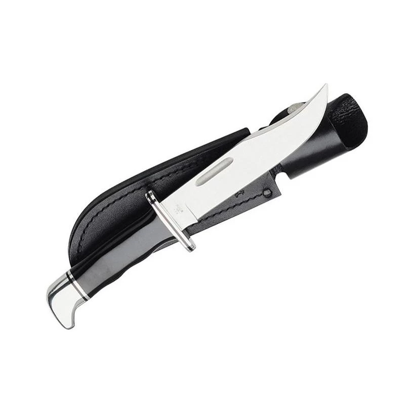Livré avec son bel étui en cuir noir, ce poignard Buck Special n° 0119BKS est destiné aux chasseurs ou aventuriers. Cette fois-ci, il se dote d’un très beau manche en résine noir, en plus d’être élégant, le manche assure également une excellente prise en main au quotidien. En plus d’une mitre en aluminium, le manche intègre aussi une garde de sécurité limitant énormément le risque de blessures. Côté lame, elle mesure 15cm de longueur et est fabriquée en acier inoxydable 420, un acier qui dispose d’une excellente résistance face à la corrosion. Personnalisable, cette même lame est munie d’un bout pointu ce qui permettra à l’utilisateur de pouvoir travailler sur des zones très serrées avec aisance. Un poignard de chasse de qualité signé Buck, très célèbre coutellerie Américaine qu’on ne présente plus.
