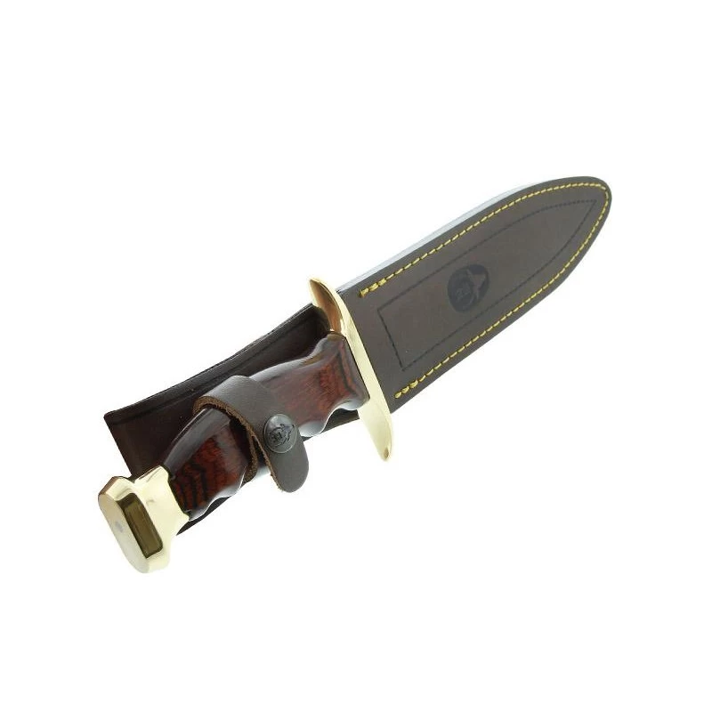 Le Bowie est un poignard incontournable de toute la gamme Muela (marque Espagnole). Les chasseurs l’apprécieront énormément pour sa grande lame fabriquée en acier inoxydable (longueur de 19cm). À noter que ce modèle est également disponible avec une lame encore plus grande (26cm) ou au contraire plus petite. C’est clairement une question de préférence sachez juste que peu importe la taille, la lame est toujours décorée par le logo Muela ainsi que par le nom du poignard, à savoir le Bowie. Elle est aussi personnalisable par gravure au niveau des deux faces (voir bouton ajouter une gravure). Ce modèle référence 9259 est muni d’un manche en stamina avec extrémités dorées pour une élégance de tous les instants durant les sessions de chasse ou aventures Outdoor. Gardez bien en tête que le poignard Muela Bowie 9259 est livré avec son étui en cuir pour une protection efficace durant les déplacements et mouvements.