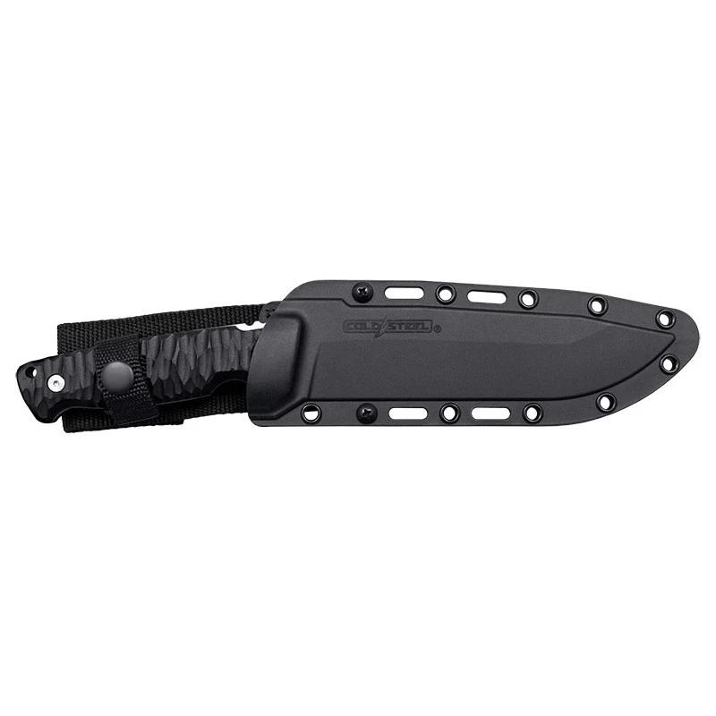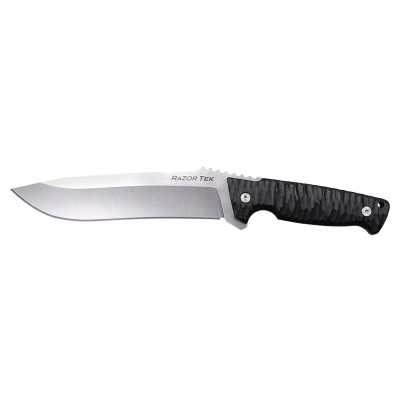Le modèle CSFX65RZR de la série Razor Tek est le plus grand : il est muni d’une lame mesurant plus de 16 cm de long pour une épaisseur de 5mm. Sa conception en acier allemand 4116SS la rend très robuste et lui confère un excellent tranchant qui se maintient pendant une longue durée. Ce couteau Cold Steel est fait pour réaliser des travaux de coupe d’envergure lors d’un stage Bushcraft, une partie de chasse, un camping sauvage ou autres activités de plein air. Si la nécessité d’effectuer une coupe précise se présente, le Jimping sur le dos de la lame vous sera d’une grande aide en vous procurant un meilleur contrôle. Le poignard Cold Steel Razor Tek CSFX65RZR possède un manche texturé extrêmement confortable, qui tient bien en main. Il est fabriqué à partir de deux plaquettes GFN assemblées par rivet sur la base métallique. Un trou en bout de manche est disponible afin d’y introduire un lacet. Le Razor Tek CSFX65RZR vous sera envoyé avec son étui Secure-Ex.